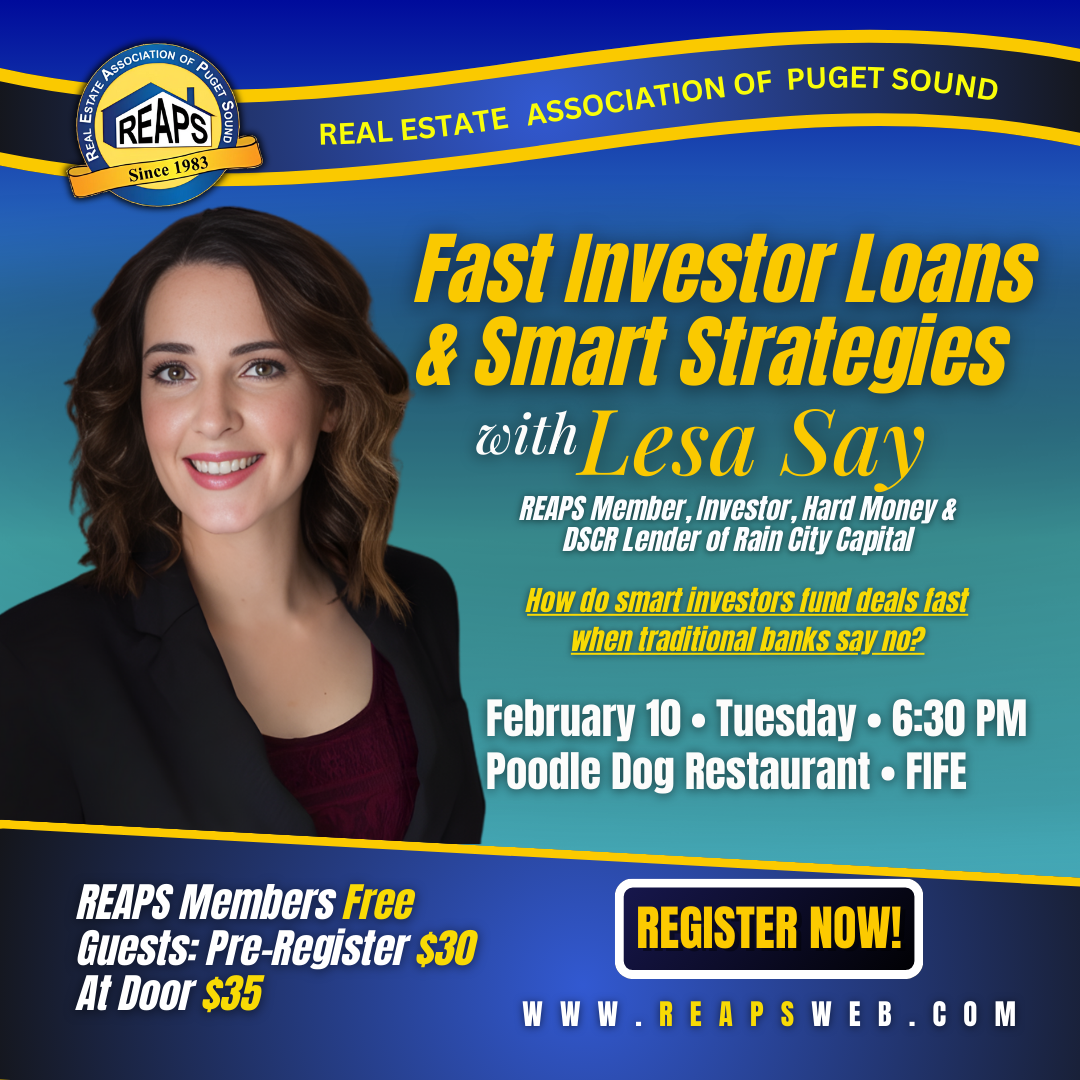 Where: Poodle Dog Restaurant in Fife- Back Meeting Room Meeting Starts: 6:30pm REAPS Members Free Guests: $30 Pre-registered and $35 At the DoorRegistration required for all events CLICK HEREFast Investor Loans & Smart Strategies~