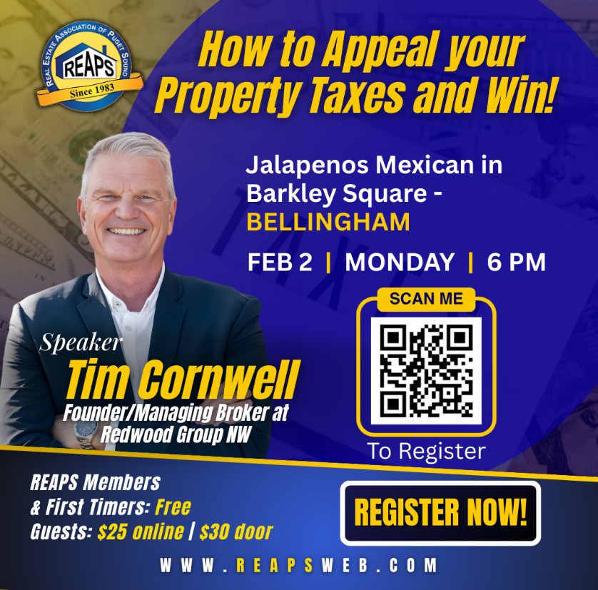 When: 1st Monday of each month - Feb 2 this month Doors Open: 6:00pm - Start Networking! and order FoodMeeting Starts: 6:30pm Speakers begin ~ REAPS Members Free Guests: $25 online pre-registration, $30 at the door FIRST TIME is FREE~ Registration required for all events CLICK HEREOUR GUEST SPEAKER: TIM CORNWELL How to appeal your property taxes and win!